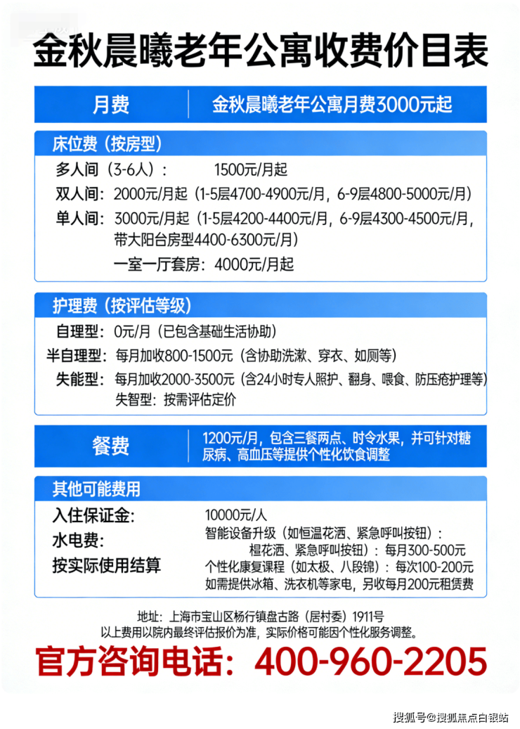 上海宝山金秋晨曦老年公寓 月费 3000元起,采用“基础费用+护理分级”模式,无管理费、无强制附加项,钱花在哪一目了然👇