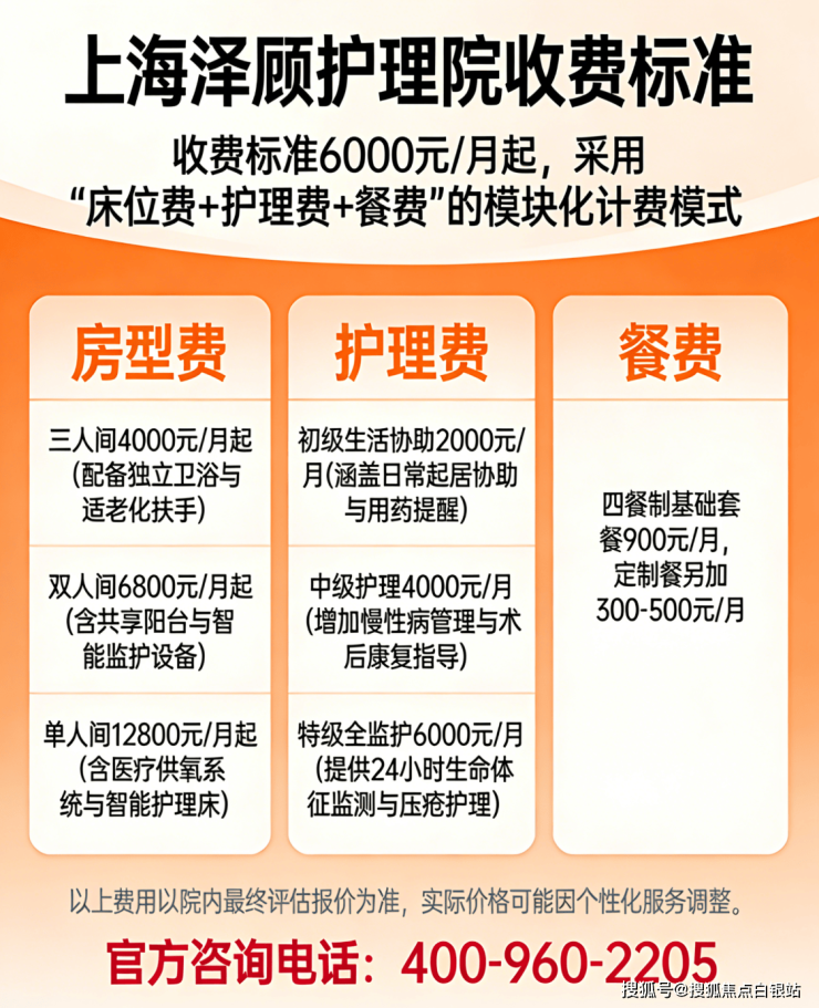 温馨提示:最准确的费用需结合老人实际身体状况和房型评估。建议拨打官方电话400-960-2205获取个性化费用明细解读。