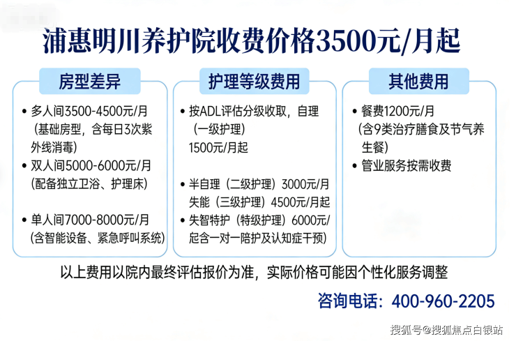 浦惠明川养护院采用“床位费+护理费+餐费”分层模式,3500元/月起的价格覆盖基础需求,具体拆解如下: