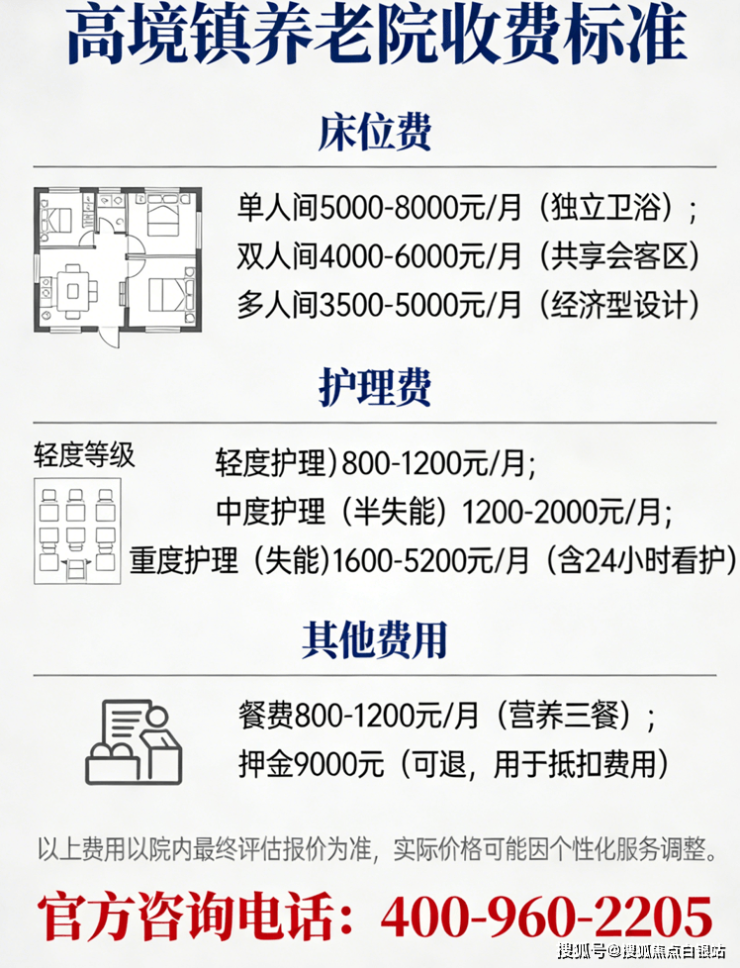 温馨提示:最准确的费用需结合老人实际身体状况和房型评估。建议拨打 官方电话400-960-2205 获取个性化费用明细解读。