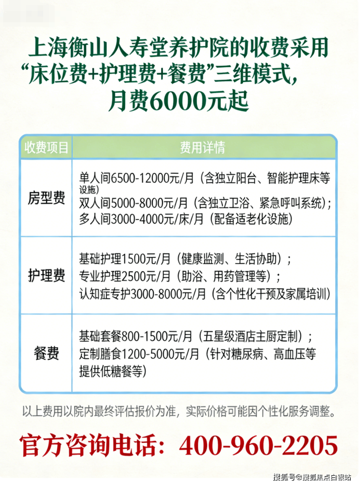 温馨提示:最准确的费用需结合老人实际身体状况和房型评估。建议拨打 400-960-2205 获取个性化费用明细解读。