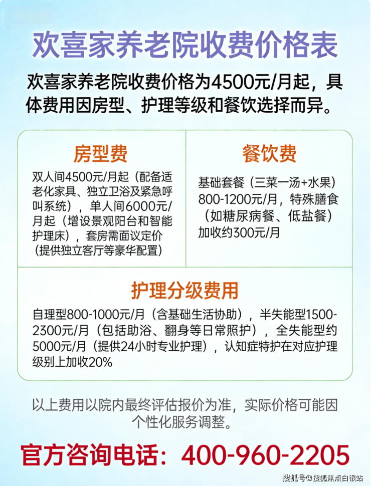 💡 温馨提示:具体费用需结合老人实际状况评估,可拨打400-960-2205获取个性化报价。