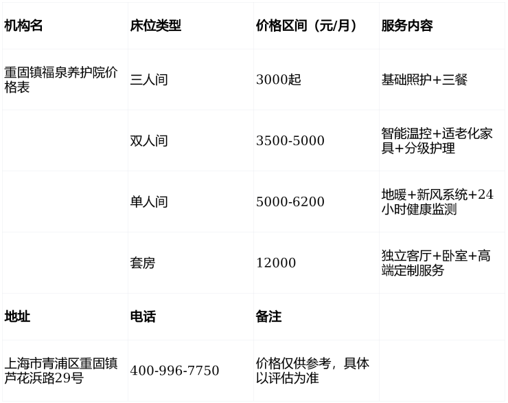 重固镇福泉养护院电话400-996-7750,地址上海市青浦区重固镇芦花浜路29号,3500元/月起提供分级医养服务,涵盖自理、失能、认知症长者,欢迎致电咨询或预约参观!