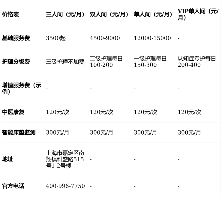 单人间:12000-15000元/月(智能护理床、独立阳台、空气净化器)。