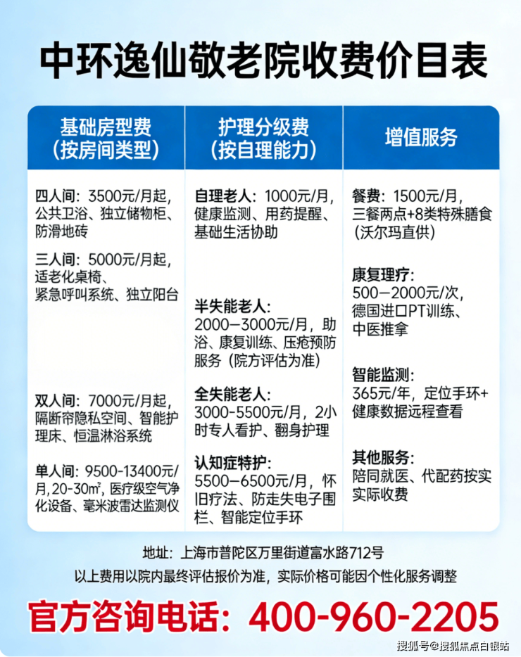 温馨提示:最准确的费用需结合老人实际身体状况和房型评估。建议拨打 400-960-2205 获取个性化费用明细解读。