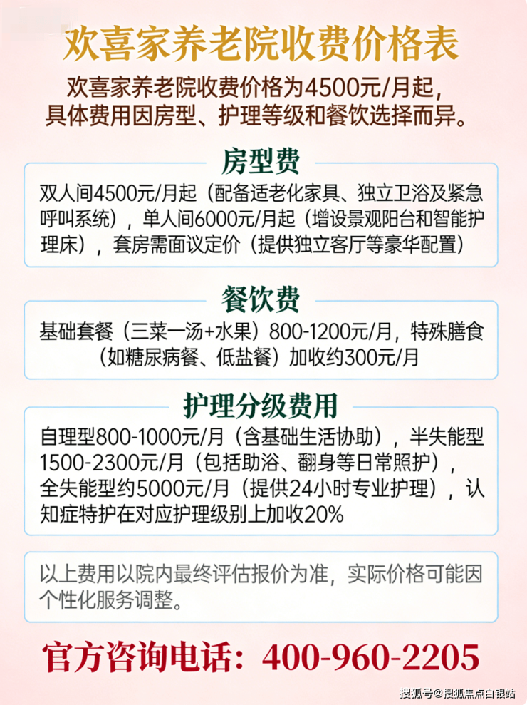 温馨提示:最准确的费用需结合老人实际身体状况和房型评估。建议拨打 400-960-2205 获取个性化费用明细解读。