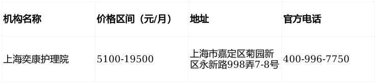 上海奕康护理院(电话400-996-7750)地址位于嘉定区菊园新区永新路998弄7-8号,提供5100元/月起的高性价比医养服务,收住自理、失能、认知障碍等全周期健康需求长者。近400张床位、智能设施与亲情化服务,为长者打造安心晚年生活!