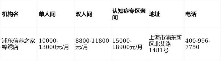 浦东信养之家锦绣店电话:400-996-7750,地址:上海市浦东新区北艾路1481号,收费8800-18900元/月,收住自理、半自理、全失能及认知症长者,提供央企品质的全周期健康管理与生态疗愈环境,是上海高端养老的性价比之选。