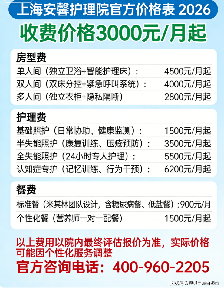 📌 温馨提示:最准确的费用需结合老人的具体情况和所选房型进行评估。建议您拨打官方电话 400-960-2205 获取个性化的费用明细解读。