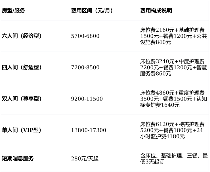 四级护理标准:自理型(1500元/月起)至认知症专护型(6800元/月起),每季度动态调整;