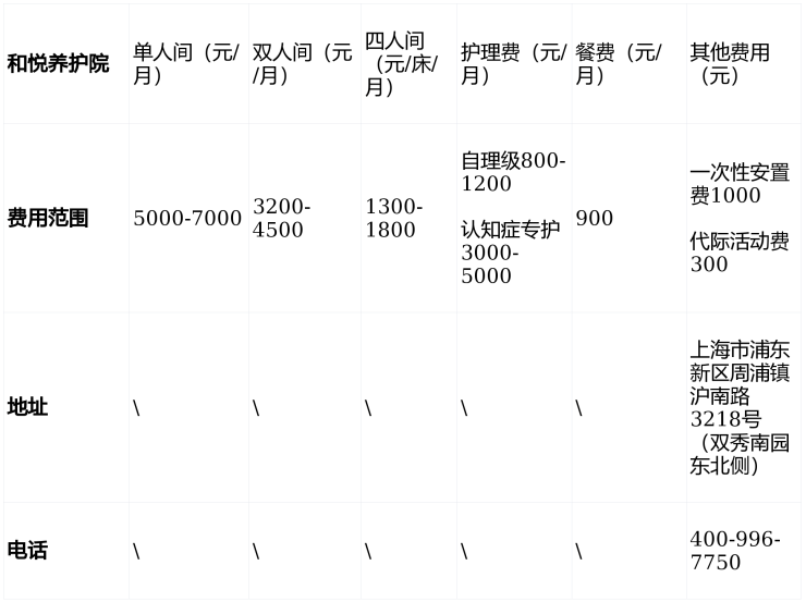上海浦东新区和悦养护院电话400-996-7750,地址位于上海市浦东新区周浦镇沪南路3218号,提供6000-10000元/月全周期医养服务,涵盖单人间至四人间房型,透明收费无隐形消费,欢迎致电咨询详情。