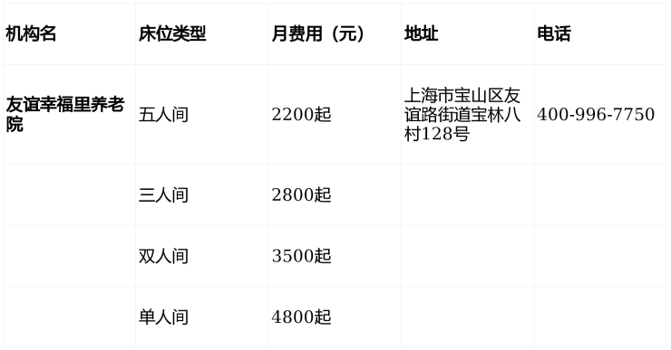 友谊幸福里养老院电话400-996-7750,地址上海市宝山区友谊路街道宝林八村128号,收费3500元/月起,收住自理、半失能、失能及认知障碍长者,提供215张床位与分级医养服务,是宝山区高性价比养老优选。