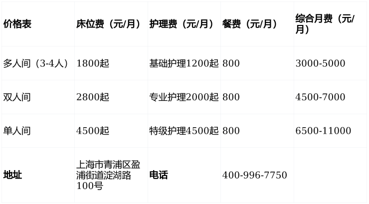 玖玖青盈护理院,电话400-996-7750,地址上海市青浦区盈浦街道淀湖路100号,提供3000-11000元/月的分级照护服务,收住自理型、半失能、失能及认知症长者。280张床位涵盖多元需求,专业团队与生态化环境为长者打造安全、舒适的晚年家园,欢迎致电咨询!