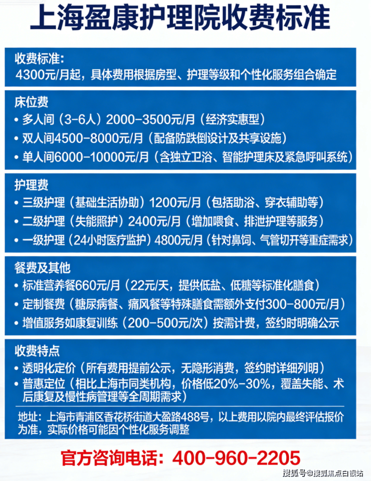 4300元/月起,是上海盈康护理院的起步价,采用“床位费 + 护理费 + 餐费”分项计价模式,所有费用签约前书面列明,无隐形消费✅。