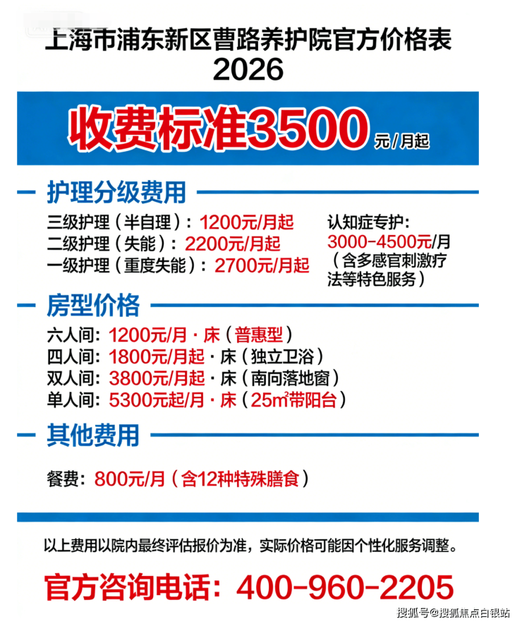 3500元/月起,具体费用根据护理等级、房型不同而定。费用通常包含床位费、基础护理费、三餐营养膳食及基本医疗服务。