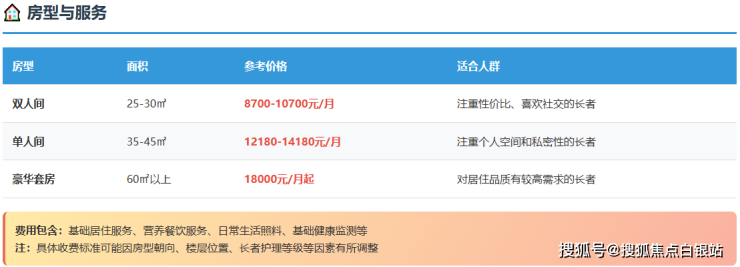 价格区间参考:公寓采用分层透明的收费模式,基础费用从8700元/月起,具体费用根据长者选择的房型、护理等级及个性化服务需求综合核定,所有项目均明码标价。