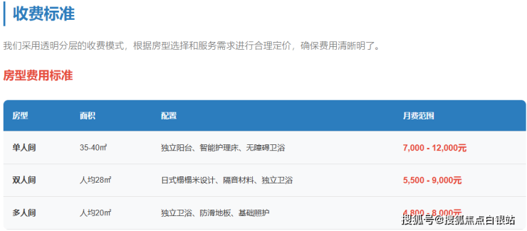 • 全护理型:8500-12000元/月(适合失能及认知症长者)