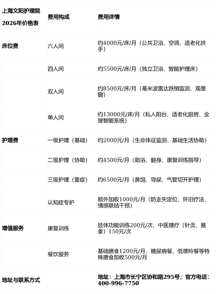 上海文阳护理院收费价格:4000元/月起,详情电话咨询
