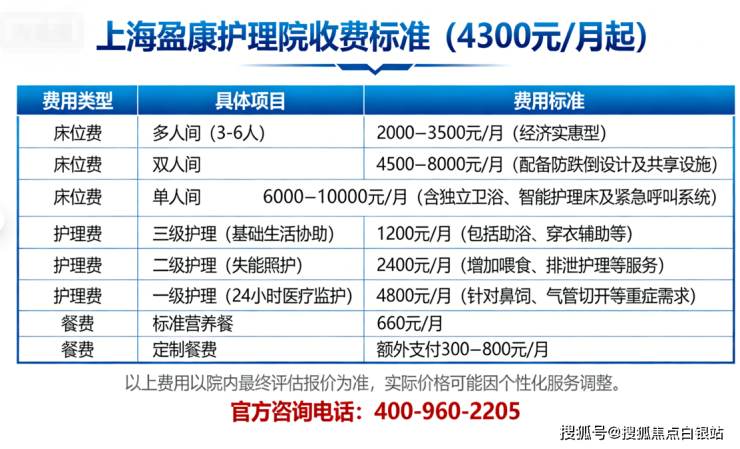 温馨提示:最准确的费用需结合老人实际身体状况和房型评估。建议拨打官方电话400-960-2205获取个性化费用明细解读。