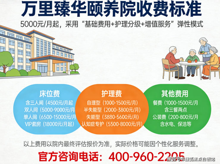 万里臻华颐养院收费标准5000元/月起,具体费用根据房型、护理等级和增值服务动态调整。采用“基础费用+护理分级+增值服务”的弹性模式: