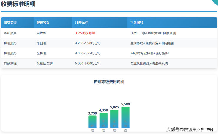 采用"基础服务费+护理分级+房型差异"的复合收费模式,月均费用3750元至8500元: