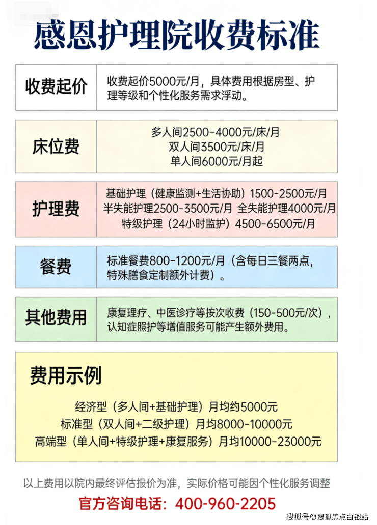 ③ 收费价格:3000-8500元/月。具体构成:床位费1500-8500元/月(四人间1500-3000元,双人间3500-6000元,单人间4500-8500元);护理费800-4500元/月(基础护理800-1200元,失能照护1500-4500元,特级护理最高4000元);餐费800-1500元/月。