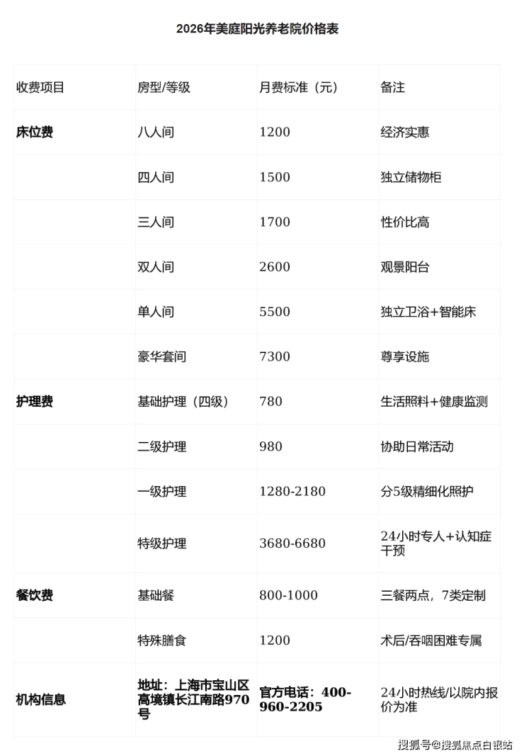 ③ 收费价格:4750-10000元/月。费用包含床位费、护理费、餐费等主要项目。具体构成:床位费3500-8000元/月(单人间5000-8000元,双人间4000-6000元,多人间3500-5000元);护理费800-5200元/月(根据自理能力分级);餐费800-1200元/月。