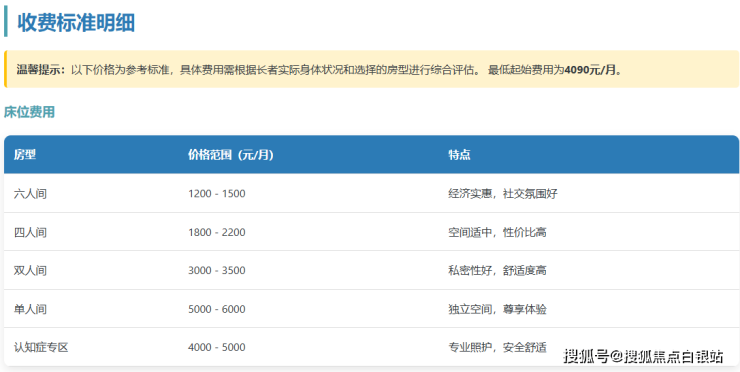**床位费:**根据房型不同分为单人间、双人间至多人间,满足不同长者的个性化需求