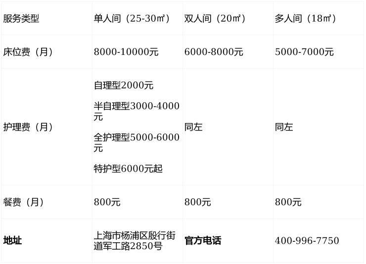 自理型:2000元/月;半自理型:3000-4000元/月;全护理型:5000-6000元/月;特护型(含临终关怀):6000元/月起。