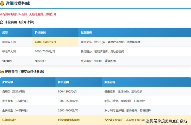 4500元/月起的价格主要是床位费,包含标准双人间(朝南采光)的居住权及配套设施。具体费用需要根据长者实际情况进行健康评估后确定,采用"床位费+护理费+餐费+增值服务"的透明计费模式。所有收费项目在签约前都会以书面形式明确告知,杜绝隐性消费。