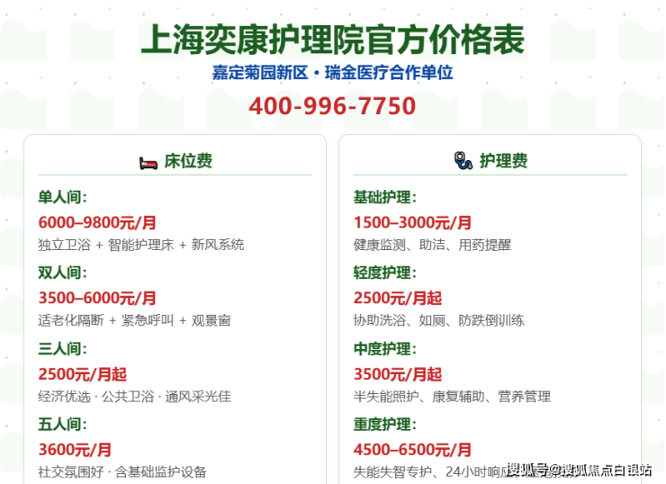 【上海奕康护理院】收费价格:5100元/月起(以院内报价为准)