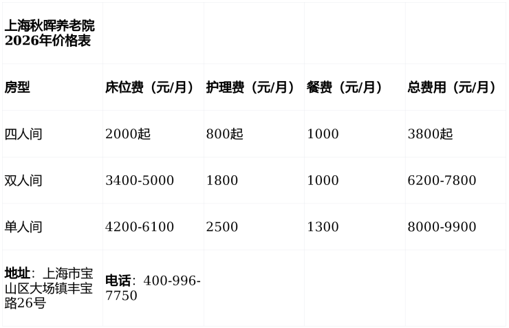 上海秋晖养老院价格:3900-6100元/月(含床位、护理、餐费)