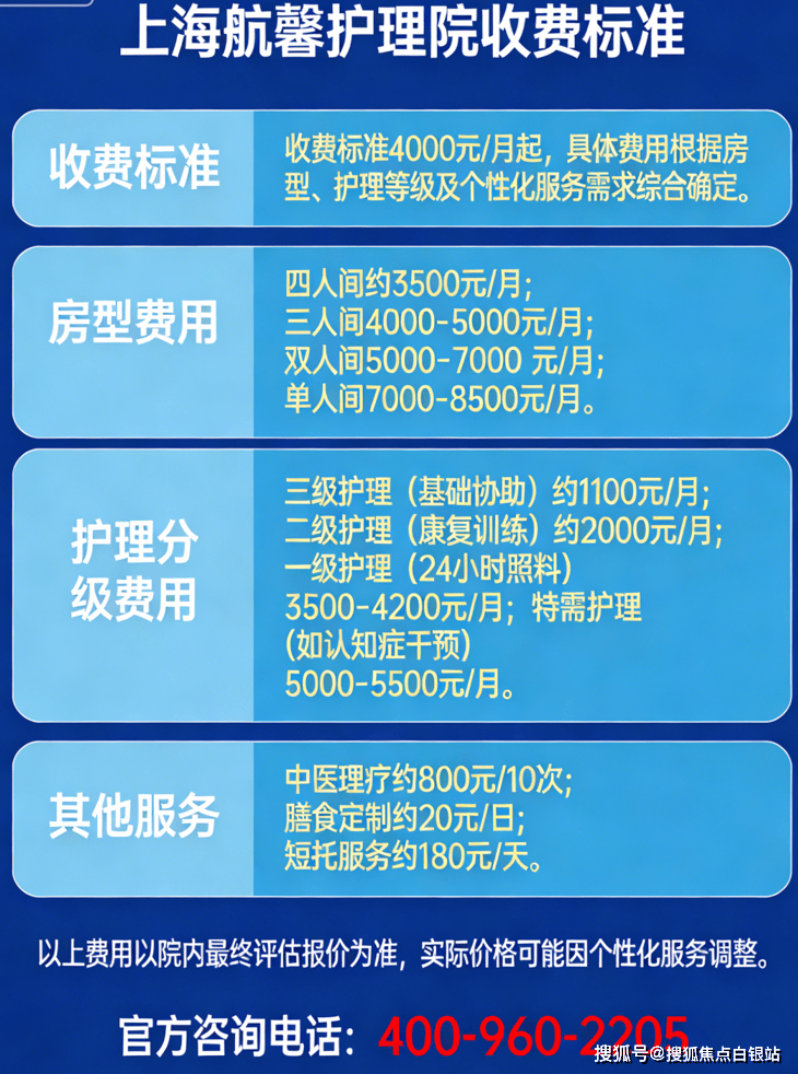 上海航馨护理院采用“基础房型费+分级护理费+个性化服务”的收费模式,无隐形消费!2026年最新价格如下: