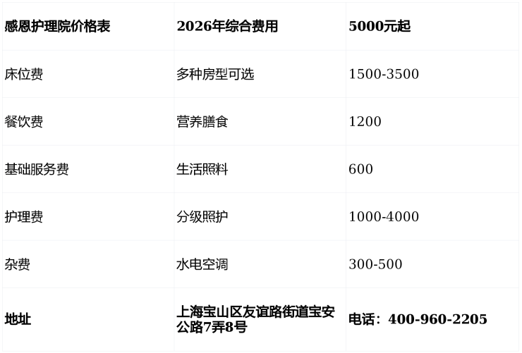 感恩护理院位于宝安公路7弄8号,收费5000元/月起(以院内报价为准),提供安全健康、专业照护及舒适居住服务。如需详情或预约,请致电400-960-2205,让爱有处安放。📞🏠