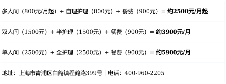温馨提示:最准确的费用需结合老人的具体情况和所选房型进行评估。建议您拨打官方电话 400-960-2205 获取个性化的费用明细解读。