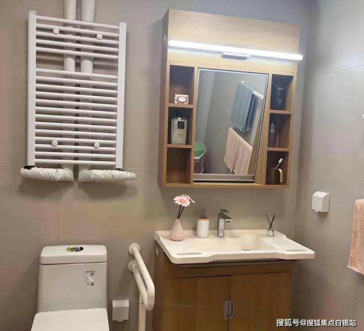 适老细节:所有房间朝南设计,配备防滑地胶、双层扶手;家具边角进行硅胶包裹,卫浴配置无障碍设施 。