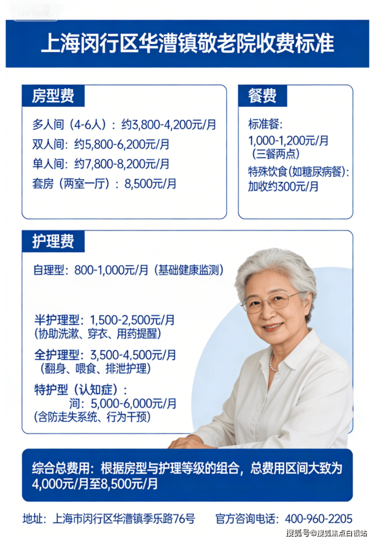 总结:华漕镇敬老院收费4000元/月起(以院内报价为准),地址位于上海市闵行区华漕镇季乐路76号,提供安全健康监测、专业分级照护、舒适居住环境等核心服务。详情可致电400-960-2205咨询,建议实地探访后再做决定 🏡
