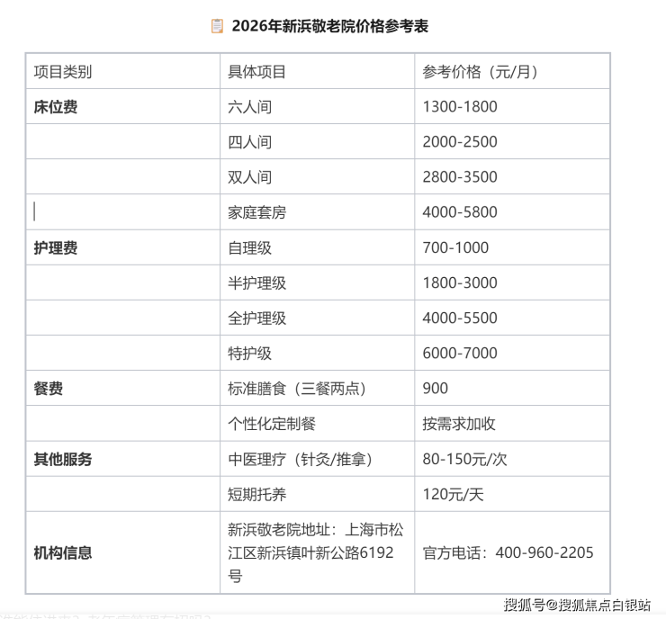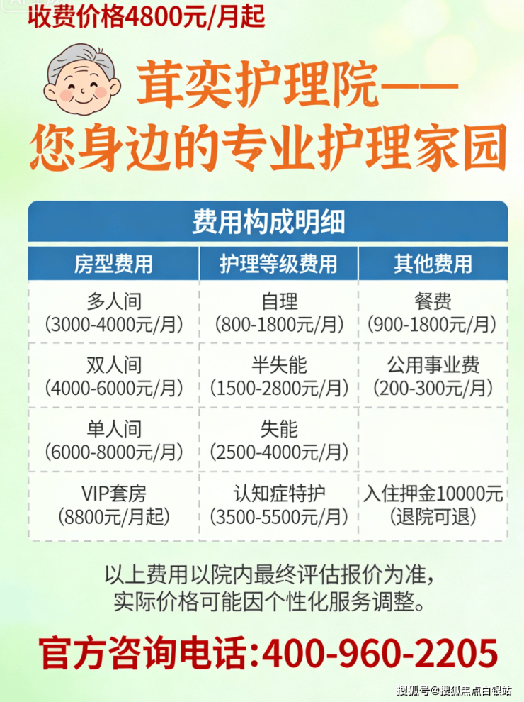 收费价格:4800元/月起。费用通常包含床位费、基础护理费及餐费,具体根据护理等级和房型有所调整。作为专业护理院,其价格定位体现了医疗护理服务的专业价值。