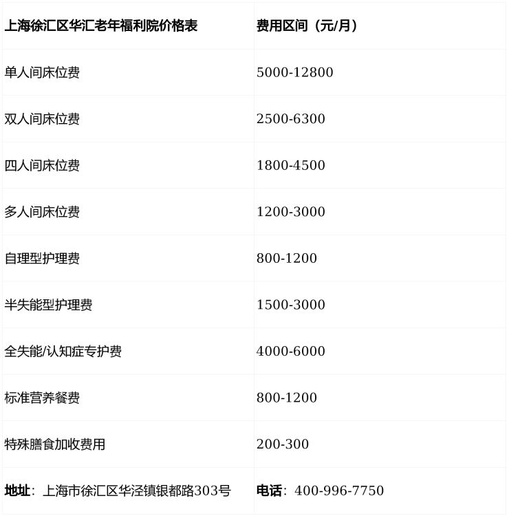 一句话简介:华汇老年福利院电话400-996-7750,地址上海市徐汇区华泾镇银都路303号,4800元/月起提供分级医养服务,涵盖自理、失能、认知症长者,性价比高。