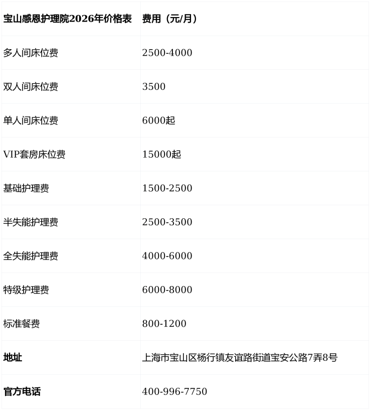 宝山感恩护理院电话400-996-7750,地址上海市宝山区杨行镇友谊路街道宝安公路7弄8号,收费5000元/月起,收住自理、半失能、全失能、认知障碍及术后康复长者,提供分级照护、智能监测与人文关怀,是宝山区高性价比养老之选。
