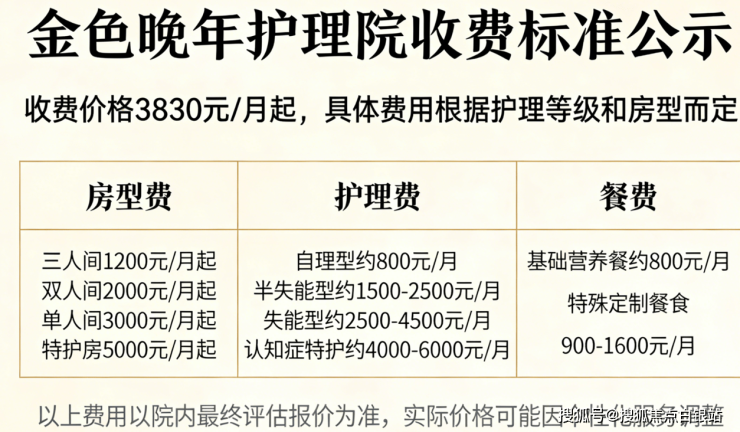上海宝山区金色晚年护理院采用“床位费+护理费+餐费”三部分透明计价模式,总费用3830元/月起(以院内报价为准),具体如下: