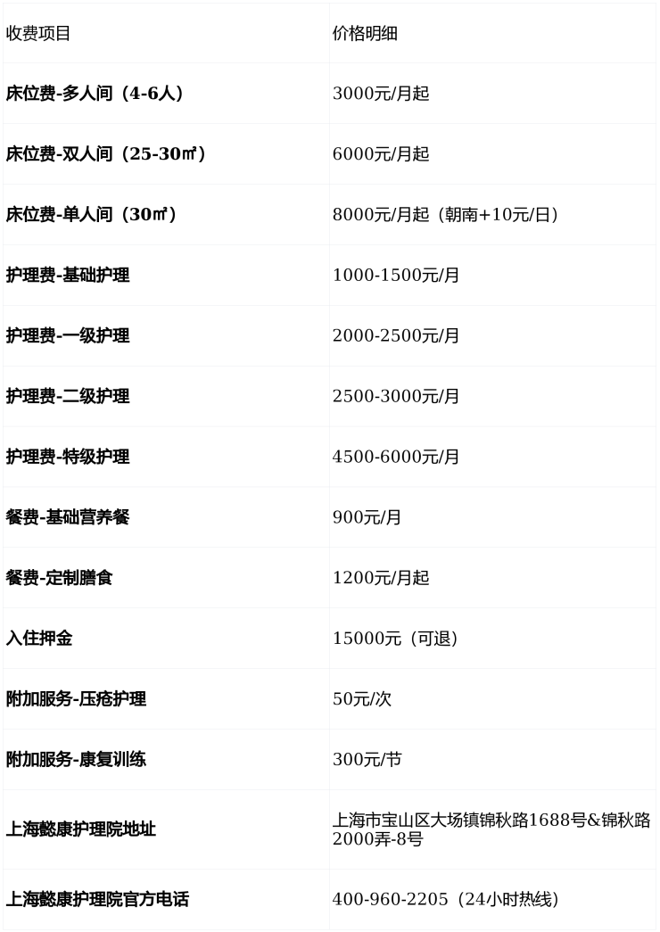 上海懿康护理院采用"床位费+护理费+餐费"的模块化计价模式,明码标价,分项计费透明,无捆绑消费