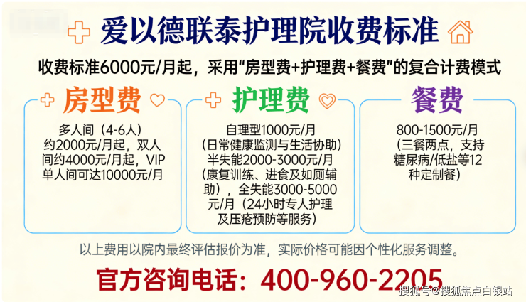 上海爱以德联泰护理院采用“床位费+护理费+餐费”三部分计价,无任何隐藏收费。