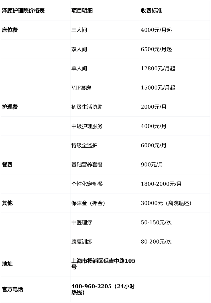 三、泽顾护理院2026年价格表