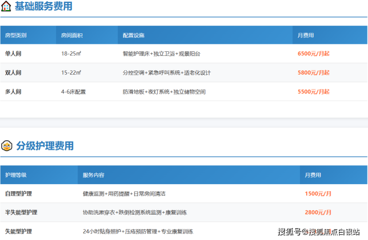 半失能老人选择单人间:基础服务费6500元/月 + 护理费2800元/月 = 9300元/月总费用