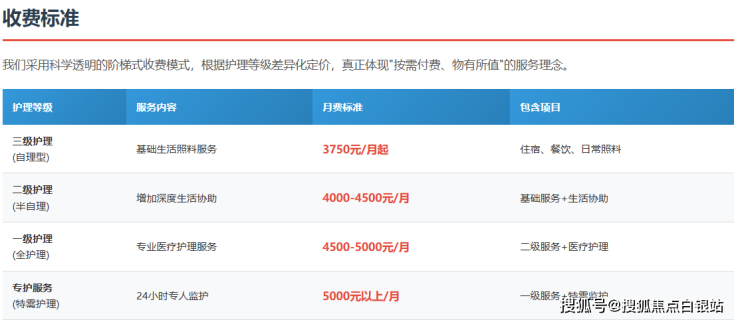 整体收费区间为3750元/月起,所有费用包含住宿、餐饮、基础护理等服务,无任何隐形消费,收费透明合理。