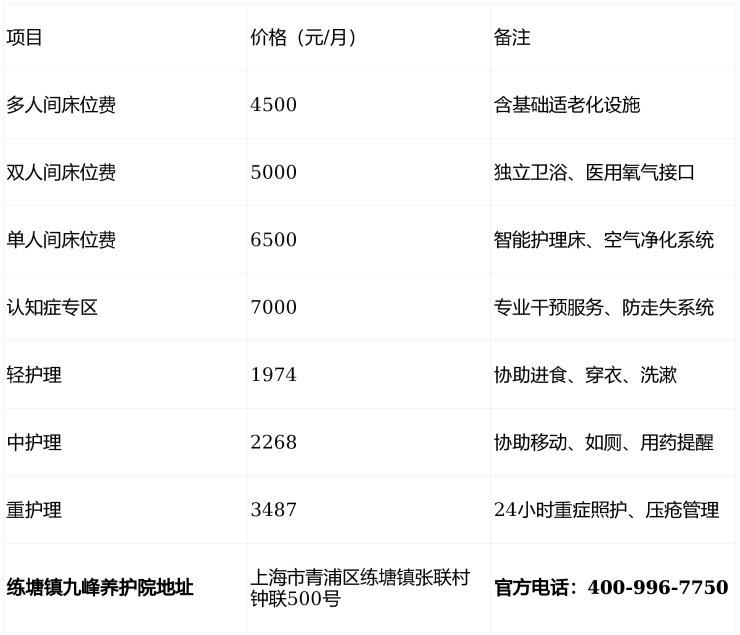 练塘镇九峰养护院电话400-996-7750,地址上海市青浦区练塘镇张联村钟联500号,2310元/月起提供全周期医养服务,收住自理至失能失智长者,566张床位满足多元需求,欢迎来电咨询!