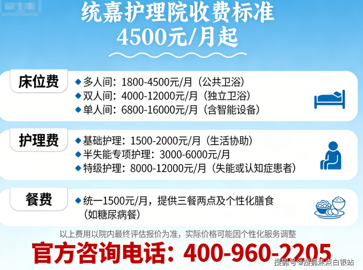 统嘉护理院收费标准为4500元/月起!这个价格包含了啥?咱们来拆解一下: