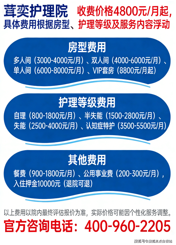 温馨提示:最准确的费用需结合老人实际身体状况和房型评估。建议拨打官方电话 400-960-2205 获取个性化费用明细解读。