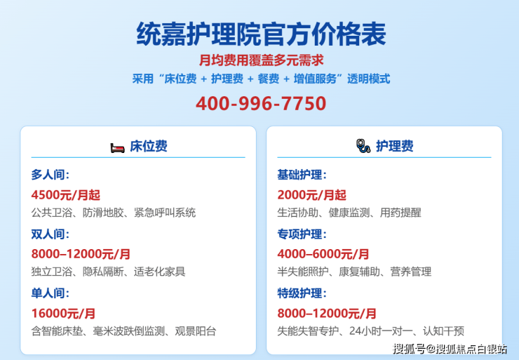 护理费:基础护理2000元/月起(生活协助),专项护理4000-6000元/月(半失能),特级护理8000-12000元/月(失能失智);